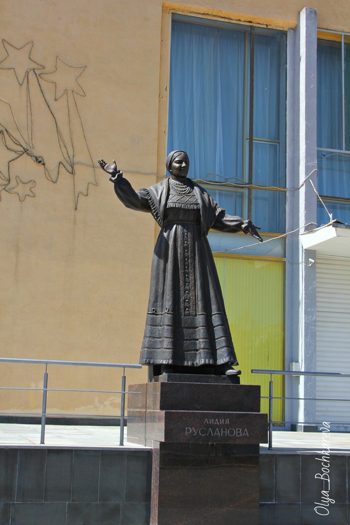 Расположен на площади у центрального входа в Саратовский областной центр народного творчества (бывший ДК «Техстекло») которому присвоено имя нашей землячки, народной артистки СССР Лидии Руслановой. Памятник представляет собой однофигурную композицию певицы, которая стоит в характерной позе - в момент исполнения народной песни. Трехметровая скульптура выполнена в литейной бронзе. Ее автором выступил заслуженный художник России Андрей Щербаков. Скульптор изобразил "царицу русской песни" в момент выступления перед бойцами на ступенях рейхстага незадолго до конца Великой Отечественной войны. На фронте, как подсчитали биографы, певица дала более 1100 концертов.