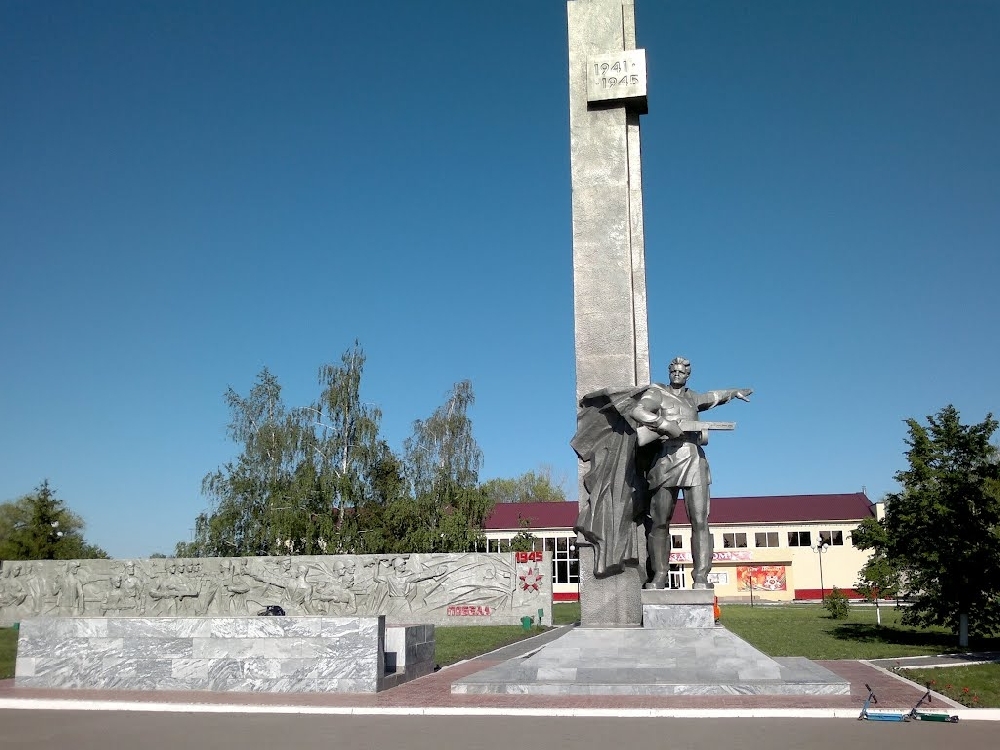 Его фигура устремлена вперед. Кажется он застыл только на мгновенье и сейчас сойдет с пьедестала, чтобы ринуться в бой. По идее создателей он олицетворяет силу и мощь Советской Армии- победительницы. Позади памятника — каменная балюстрада с барельефами, изображающими различные эпизоды войны и мирное время. Авторы: скульпторы Бодров Владимир Петрович, участник Великой Отечественной войны, и Б.П.Берков. Архитектор – Т.И.Гаврилова. Много в области памятников, посвященных войне, но этот памятник один из самых выразительных и динамичных.